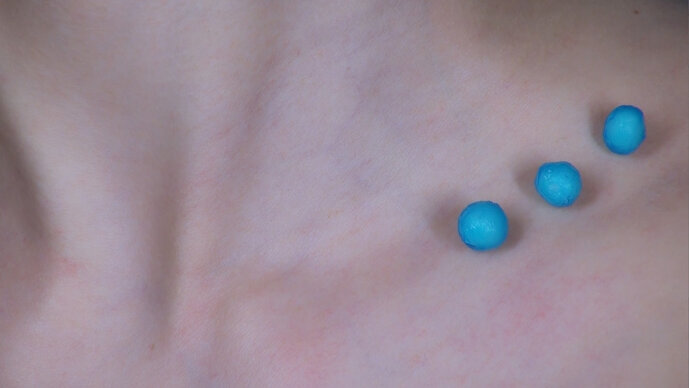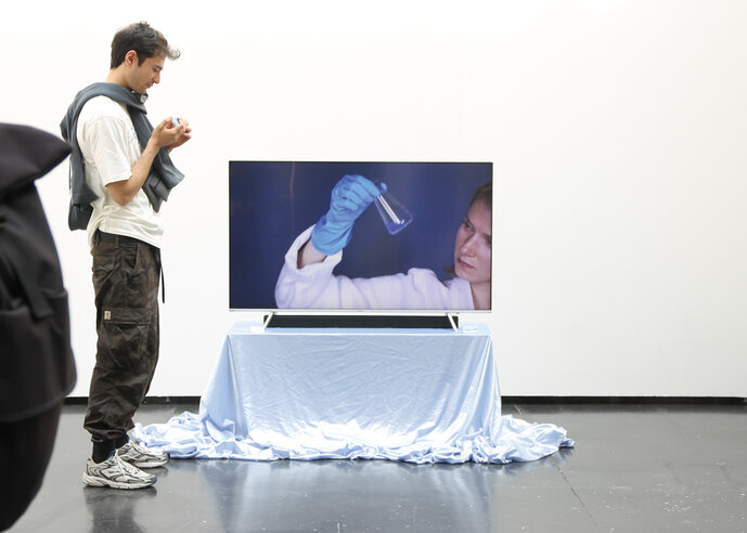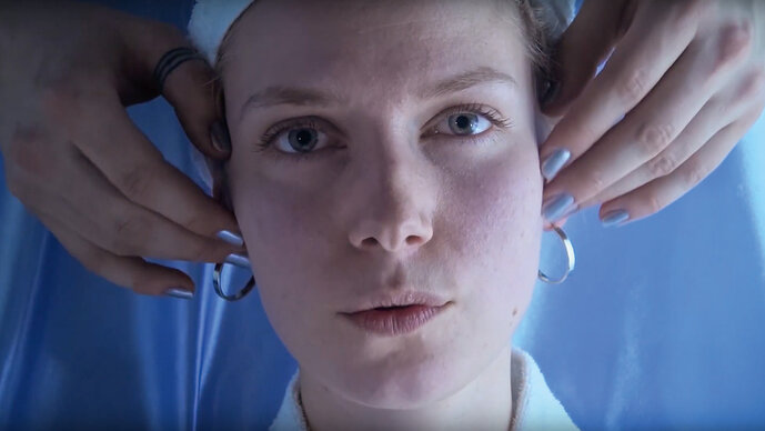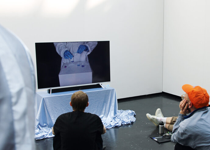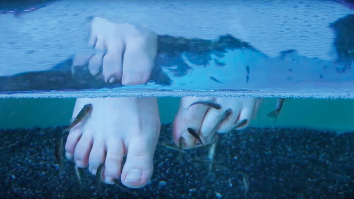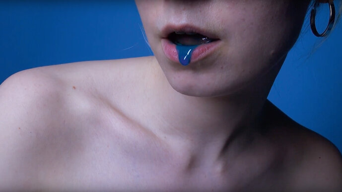 In dem Video wird diese Logik umgedreht. Es zeigt den Prozess der Herstellung von Süßigkeiten aus Körperflüssigkeiten wie Blut, Schweiß und Speichel – alles in synthetischem Blau gefärbt. Durch die Spa-Ästhetik und den sterilen Look eines Labors entstehen Bilder, die Gefühle des Ekels hervorrufen. Die Handlung spielt lose in einem Pediküre-Studio, wo kleine Fische abgestorbene Hautzellen von den Füßen fressen. Dort offenbaren die Schönheitsbehandlungen – und noch mehr das dahinter stehende Geschäft – ihren Hang zum Absurden.