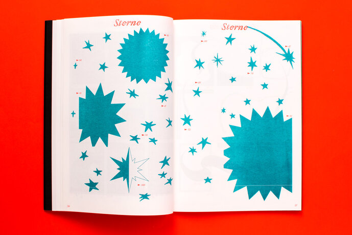 Die isolierten Elemente sind mit Riso gedruckt, einer Druckmethode, die, wie der für die originalen Hefte verwendete Tiefdruck, in einzelnen Farbflächen druckt, und daher Spezialfarben und unübliche Kombinationen ermöglicht.