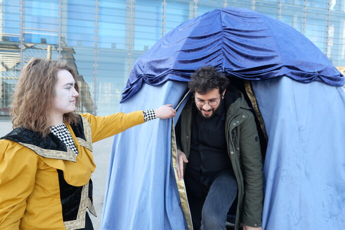 In meiner Fiktion ist das Vomitorium ein Zwischenzustand. Es gibt einen Ein‐ und einen Ausgang. Interessiert hat mich dabei vor allem die Erzählstruktur des Narrativen in einem immersiven Erlebnisraum. Das Machineninnere ist organisch, atmet, riecht, spricht. Sie wurde von der magischen Schaustellerin bei Ebay Kleinanzeigen gefunden, die versucht, die Geschichte der Maschine aufzuarbeiten, und ihrer würdig weiter zu tragen. Die Maschine wurde von einem Einsiedler Ende des 19. Jahrhunderts erfunden, der eine sehr innige Beziehung zu ihr pflegt. Als das Dorf das mitbekommt, sind sie der Geschichte gegenüber nicht positiv gestimmt und bringen ihn um. SchaustellerInnen werden auf die Maschine aufmerksam und stellen sie auf dem Jahrmarkt aus. Die Maschine ist mit der Situation überfordert. Sie weiß nicht, wo ihr Erfinder ist, sie kann nur sehen, was in ihr passiert. Die Leute kommen also ratsuchend in sie hinein, doch wurde sie bald von anderen Attraktionen überholt. Sie gerät an einen Sektenführer, der versucht, seine Anhängerschaft mit der Maschine zu begeistern. Nach und nach gerät sie in Vergessenheit, landet im Keller und schließlich bei mir. Als magische Schaustellerin bin ich ihr Komplize. Ich locke die Leute an, damit sie die Möglichkeit bekommt, ihre Geschichte zu erzählen.