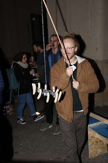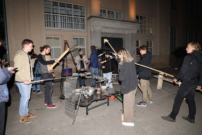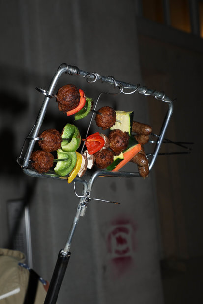 Unter Anleitung von Studierenden des Fachbereichs Produktdesign der HfG Karlsruhe wurden die Studierenden des ersten Semesters in die Werkstatt eingeführt und erstellten alle Werkzeuge und Utensilien, um ein Grillfest für den gesamten Fachbereich zu veranstalten. Tassen und Teller wurden aus Ton geformt, Schrott zu Ess- und Grillutensilien kombiniert und andere Teile zu einem Grill zusammengefügt, auf dem Fleisch und Gemüse zubereitet werden konnte. Das lose Sammelsurium aus Materialien wurde zu Hockern oder Bänken umgestaltet, auf denen sich alle um eine Feuerstelle außerhalb der Hochschule versammelten und gemeinsam in das Semester starteten.