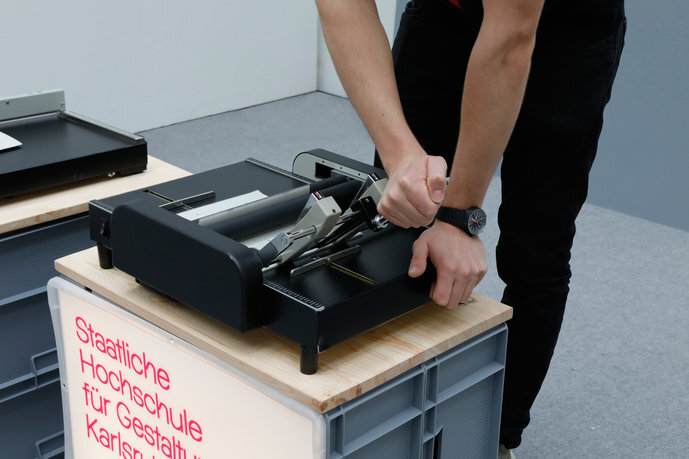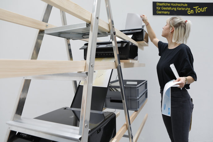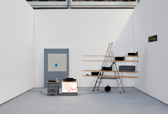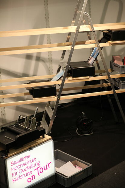 Eine kompakte und leicht zu montierende Wanderinstallation zur Repräsentation der HfG Karlsruhe auf Messen und Veranstaltungen, erstmals vorgestellt auf der Buchmesse in Frankfurt 2018. Gestaltet von Studierenden der Fachgruppen Kommunikationsdesign und Produktdesign unter der Leitung von Chris Kabel.