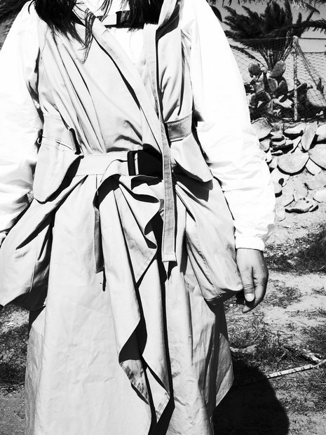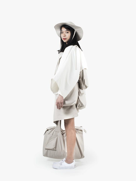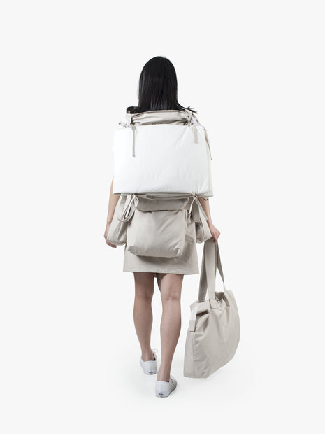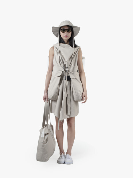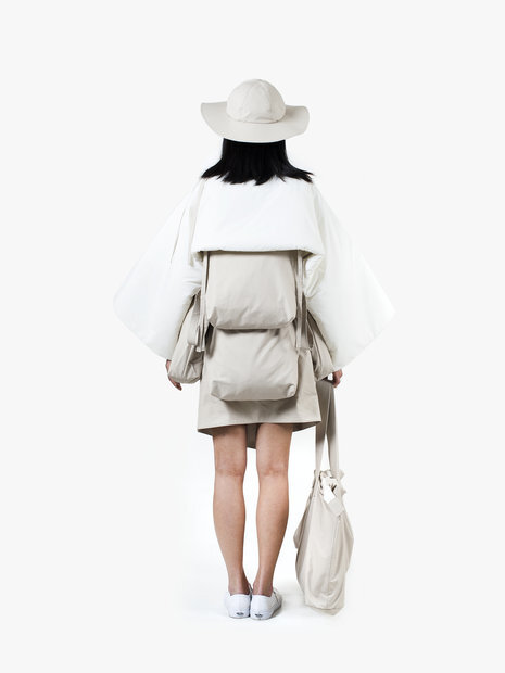 Mit "Versatile Vagabond" will Shanmei Yao einen Beitrag zu verantwortungsvollerem und buchstäblich unbeschwerterem Reisen leisten. Es handelt sich um ein multifunktionales Kleidungs- und Taschenset für eine kürzere Reise ohne (und zur Vermeidung von) einzucheckendem Gepäck. Der Stauraum für leichteres Gepäck, Kleidung und Wäsche wird mit mehreren Taschen über den Körper verteilt. Das Kleidungsstück bietet verschiedene Kombinationsmöglichkeiten und versteht sich als modulares und experimentelles System.