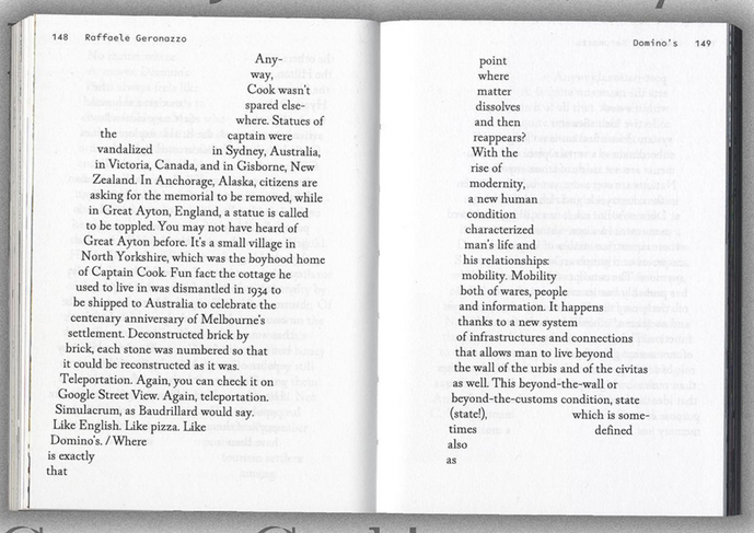 Vielleicht haben Sie noch nie von Great Ayton gehört. Es ist ein kleines Dorf in North Yorkshire, in dem Captain Cook als Kind lebte. Das Cottage, in dem er lebte, wurde 1934 abgebaut, um zur Hundertjahrfeier der Besiedlung Melbournes nach Australien verschifft zu werden. Jeder einzelne Stein wurde nummeriert, damit er so wieder aufgebaut werden konnte, wie er war. Teleportation. Auch hier können Sie bei Google Street View nachschauen. Nochmals: Teleportation. Simulakrum, wie Baudrillard sagen würde. Wie Englisch. Wie Pizza. Wie Domino's.