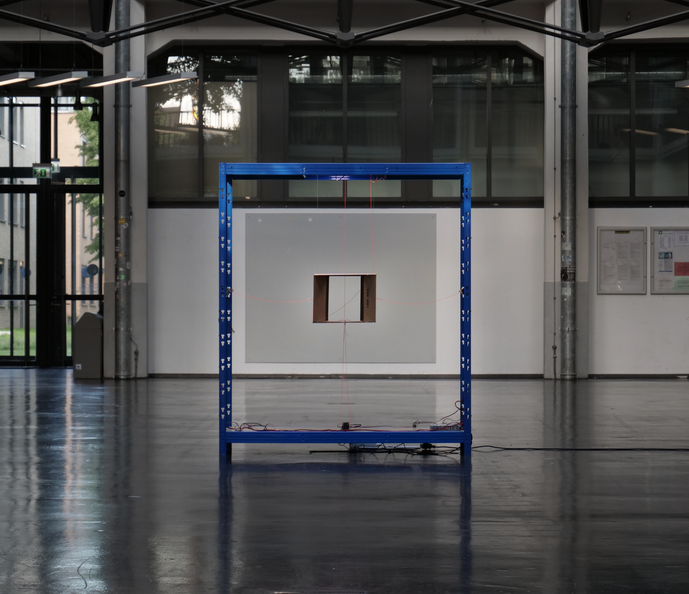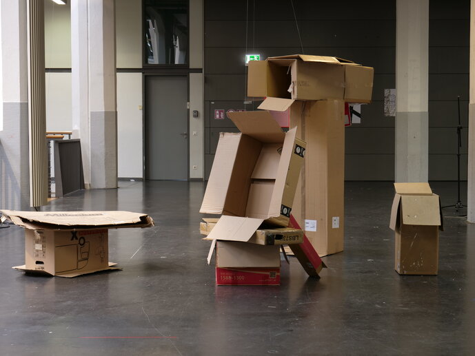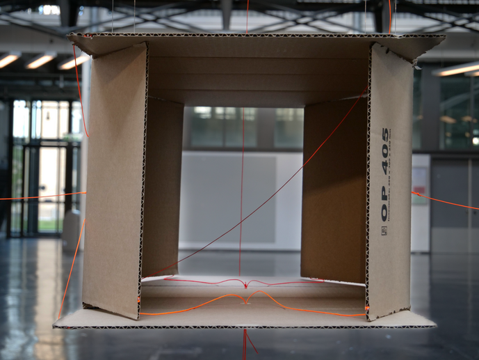 „Boxen - Karton als Protagonist im Netzwerkkapitalismus“ behandelt das als trivial und krude aufgefasste Material der Kartonbox. Seine Rolle des unauffälligen, zweckmäßigen Nebendarstellers wird invertiert und das kurzweilige Massenprodukt wird ein Fetisch des Netzwerkkapitalismus. Zahlreiche Akteure des Netzwerks zerren über rote Fadenverbindungen durch Schrittmotoren an der Box. Sie bewegt sich in ihrem Rahmen, einem Industrieschwerlastregal, gibt nach und streubt sich, faltet sich auf, schließt und öffnet sich – manchmal scheinbar zielführend - manchmal willkürlich. Unvorhersehbare Momente bestimmen die Choreographie. Der Karton verhakt sich, zeigt einen eigenen Willen.