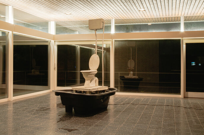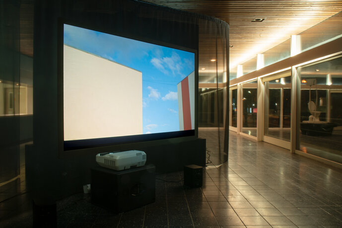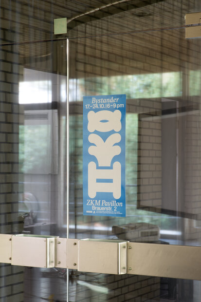 Die Ausstellung Bystander untersucht die Beziehung zwischen Erinnerungskultur und Architektur. Sie umfasst drei Werkgruppen: zwei Videos und eine Skulptur, die aktiviert werden kann, um einem Springbrunnen zu ähneln. Die Besucher:innen wurden durch eine zeitbasierte, sich wiederholende Aktivierung jedes einzelnen Werks durch die Ausstellung geführt. Dadurch entstand eine Dramaturgie zwischen den Werken, indem die Ereignisse im Raum reduziert wurden.