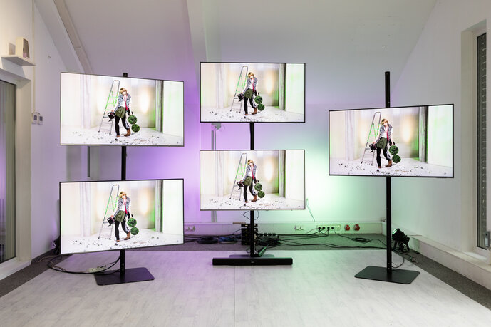 Die Arbeit übersetzt diese fiktive Identität in ein irritierendes Szenario, das zwischen Gartenfest, Ausstellung, Performance und Büroalltag changiert. Im Zentrum stehen zwei Ebenen: Zum einen die Präsentation der IDOLLs, einer Serie neuer weiblicher Musteridentitäten, die im Format einer Teleshopping-Show als innovative Lösung zeitgenössischer Identitätsprobleme vermarktet werden. Zum anderen der Blick in Erikas Büroalltag. Umgeben von Plastik-Buchsbaumbüschen, Teppichboden und generischen Büromöbeln ist sie gefangen im Moment des Fotos und der Reproduktion ihres Gesichtes.