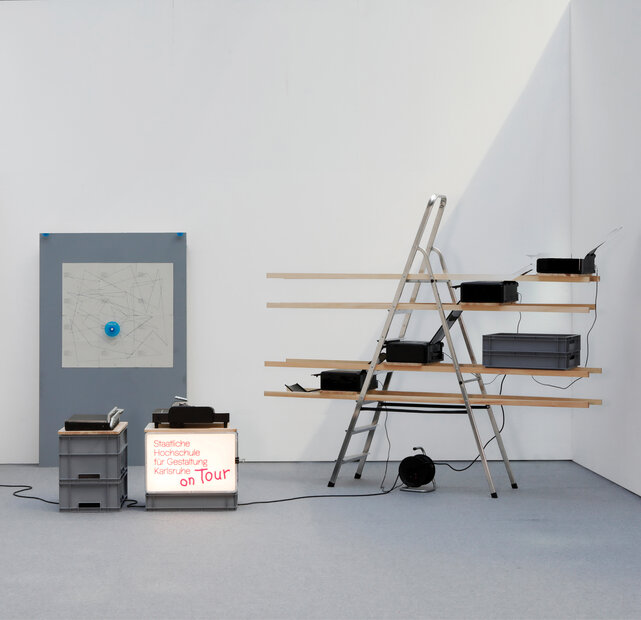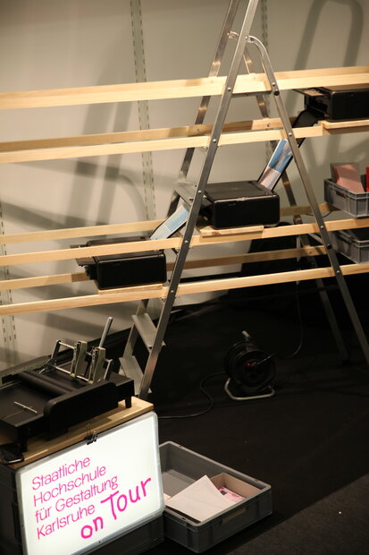 Eine kompakte und leicht zu montierende Wanderinstallation zur Repräsentation der HfG Karlsruhe auf Messen und Veranstaltungen, erstmals vorgestellt auf der letztjährigen Buchmesse in Frankfurt und von Studierenden der Fachgruppen Kommunikationsdesign und Produktdesign unter der Leitung von Chris Kabel gestaltet.