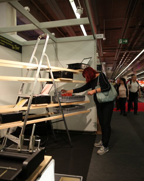 Vor Ort wurden auf einer kleinen Produktionslinie Notizbücher hergestellt, die Informationen über unsere Hochschule enthalten und der Öffentlichkeit angeboten wurden. An unserem Stand waren neben C, M, Y und K eine Leiter, vier synchronisierte Tintenstrahldrucker, ein V-Plotter und ein Booky-Wooky zu sehen.